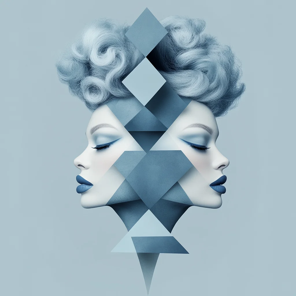 Две лица в профил, симетрично наредени едно срещу друго, преплетени с триъгълници и ромбове в студено синьо и сиво-синьо. Затворените очи. Обемната, стилна прическа. Всичко е поставено с онова спокойствие на композиция, която знае точно какво прави и не се нуждае от обяснение. Геометричните форми не украсяват портрета — те се вписват в него, прорязват го, сливат се с него. Границата между лицето и структурата стане невъзможна за намиране. Усещането е за прецизност, за студена елегантност, за нещо, което е едновременно рационално и дълбоко емоционално.
