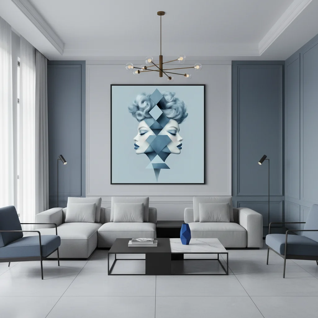 „Симетрия“ е образ с интелектуална тежест и визуална прецизност — влиза в пространството и задава въпрос, на който стаята отговаря с времето. Работи в кабинет, хол или спалня — всяко пространство, което може да понесе концептуална дълбочина без да се чувства натоварено. Студената синьо-сива палитра го прави естествен съсед на бели, светлосиви и антрацитни стени, на метал и стъкло, на интериор с минималистична или авангардна философия. Правилната рамка — тясна, метална или черна — довършва геометричния му характер.