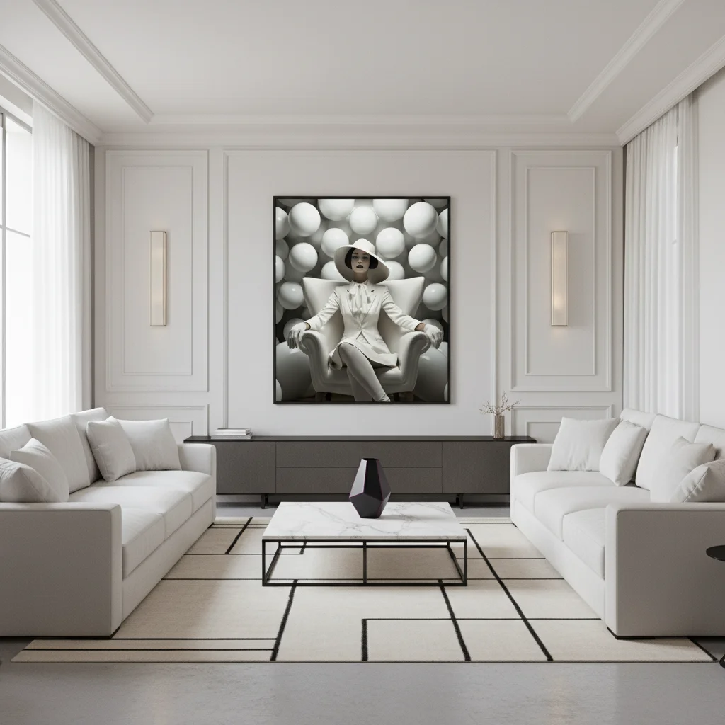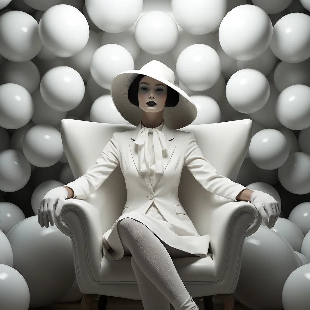 „Бяла безкрайност“ е елегантен принт, който изобразява дама в бял костюм, седнала в кресло сред море от бели сфери. Композицията носи усещане за чистота, лека ретро елегантност и мечтателна илюзия за безкрайност.