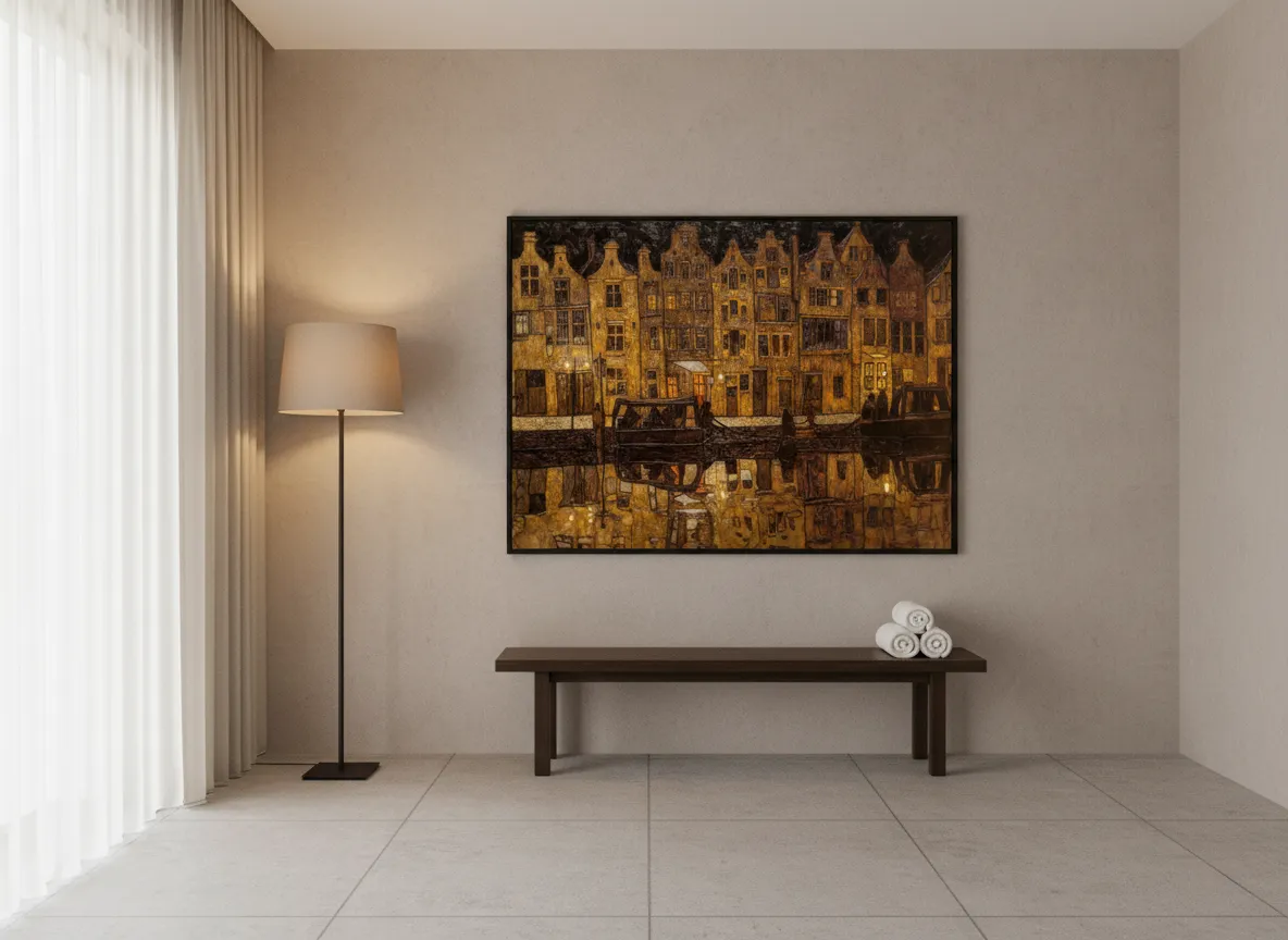 „Брюж“ е атмосферeн принт за стена с нощен канал в Брюж под голяма луна – класически къщи, водни отражения, светлини и лодки по брега в топли и тъмни тонове. Композицията носи усещане за романтика, спокойствие, градска магия и леко бягство в европейска вечер. Идеален за хол, спалня, кабинет или пространство с уютен, пътешественически акцент.