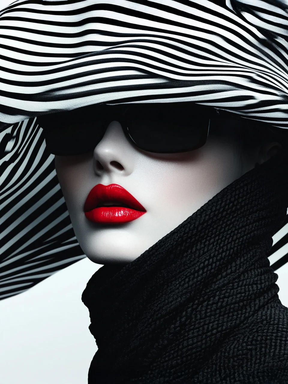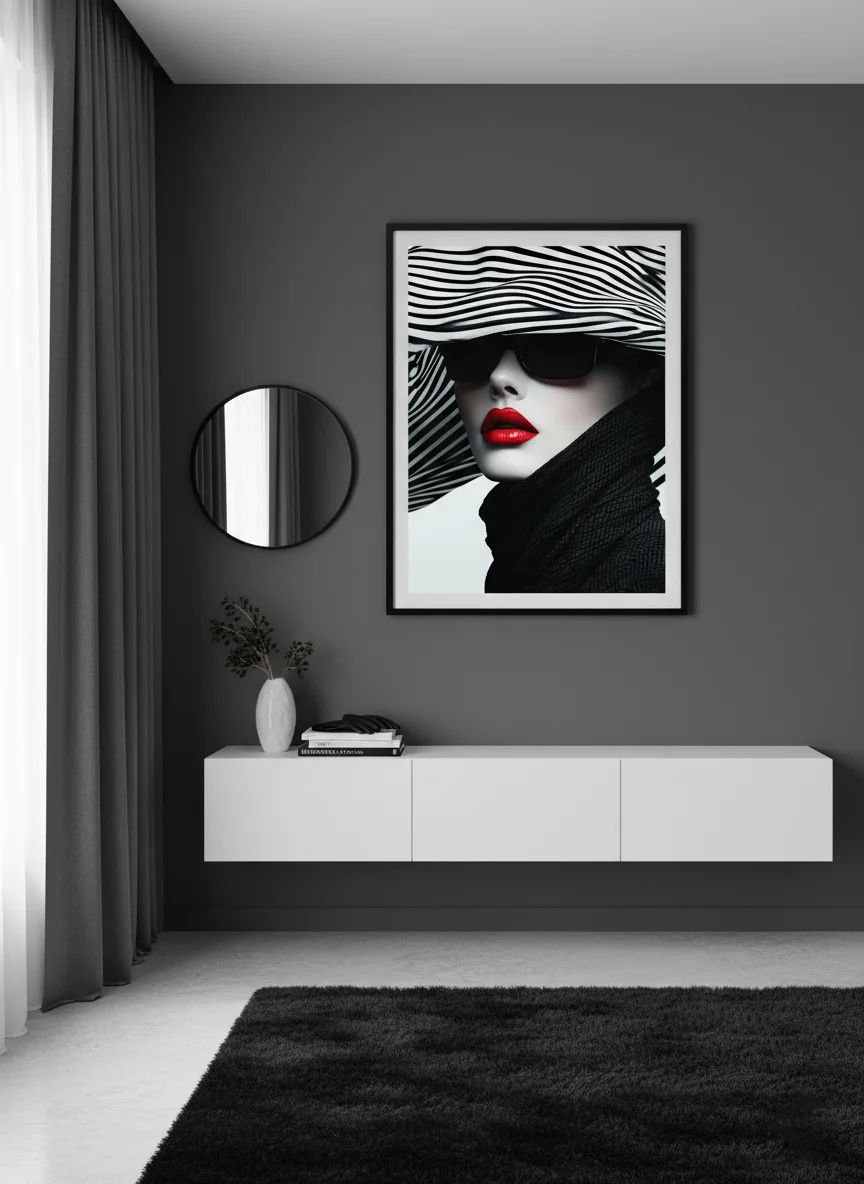 „Черно-бели райета“ е елегантен принт за стена с жена в голяма раирана шапка, тъмни очила и яркочервени устни на черно-бял фон – висок контраст и моден стил. Композицията носи усещане за сила, мистерия и леко бягство в света на висока мода. Идеален за спалня, дамска стая, кабинет или пространство с модерен, артистичен акцент.