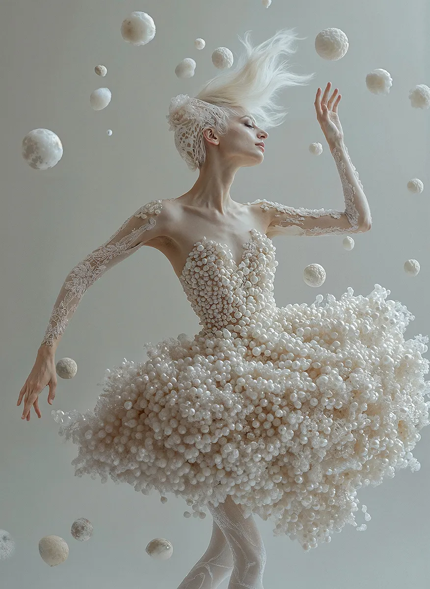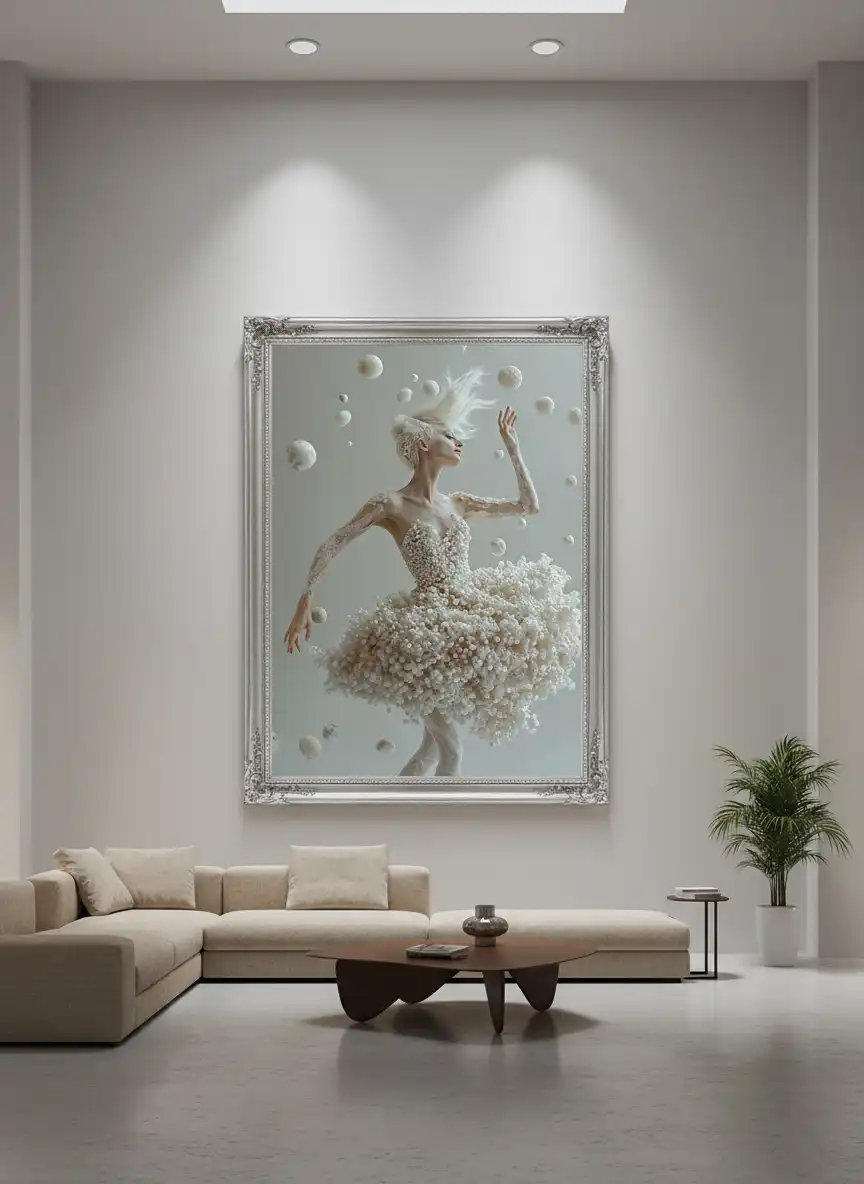 „Ефирна орбита“ е сюрреалистичен принт за стена, който изследва темите за лекотата, движението и вътрешната свобода. Централният образ представя женска фигура в изящна, почти скулптурна рокля, изградена от фини органични форми, напомнящи перли или въздушни мехурчета. Около нея се носят сферични елементи, които създават усещане за безтегловност и тихо въртене в собствена вселена.