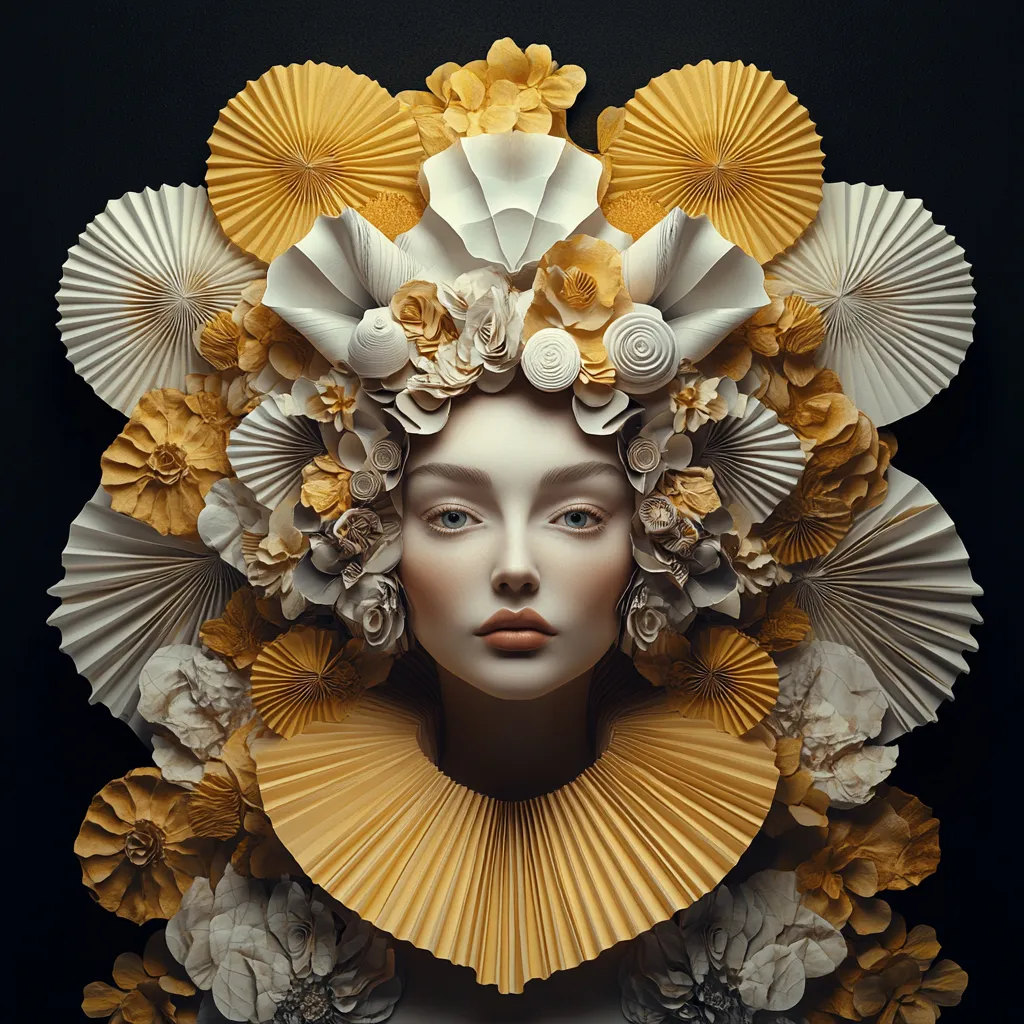 Фигурата стои в тъмнината като живо ядро на тишината. Лицето е порцеланово гладко, почти нереално спокойно — и точно около него се разгръща цяла архитектура от хартия. Кръгли ветрила, розети, прецизни сгъвки, наредени с логика, която е едновременно геометрична и органична. Не като костюм. Като трансформация.