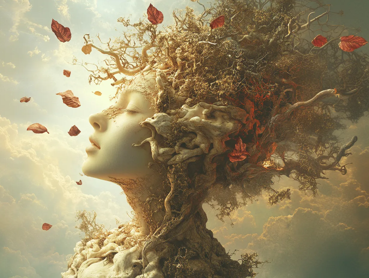 Корени е сюрреалистичен принт за стена, в който човешкото лице не е отделено от природата, вплита се с нея. Клони, корени и дървесни жилки вместо кова, сякаш лицето е продължение на земята, а земята — продължение на образа. Листата, които се носят около фигурата, не са движение на вятър, а движение на мисъл. Това е образ на трансформация — между плът и дърво, между дъх и почва, между човек и среда.
