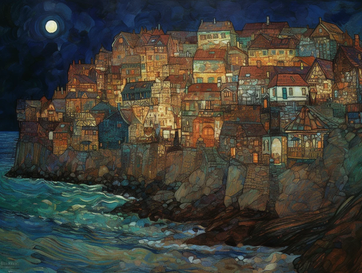 Селцето е кацнало върху сурови скали – не живописно кацнало, а упорито, сякаш се държи за ръба на света с две ръце. Топлите цветове на къщите контрастират с тъмната морска бездна под тях. Луната е висока и ярка, хвърляйки сребърни отблясъци по вълните. Стилът е мозайков – сякаш някой е сглобил сцената от малки парчета светлина и нощ, и всяко парче е взето от различен час.