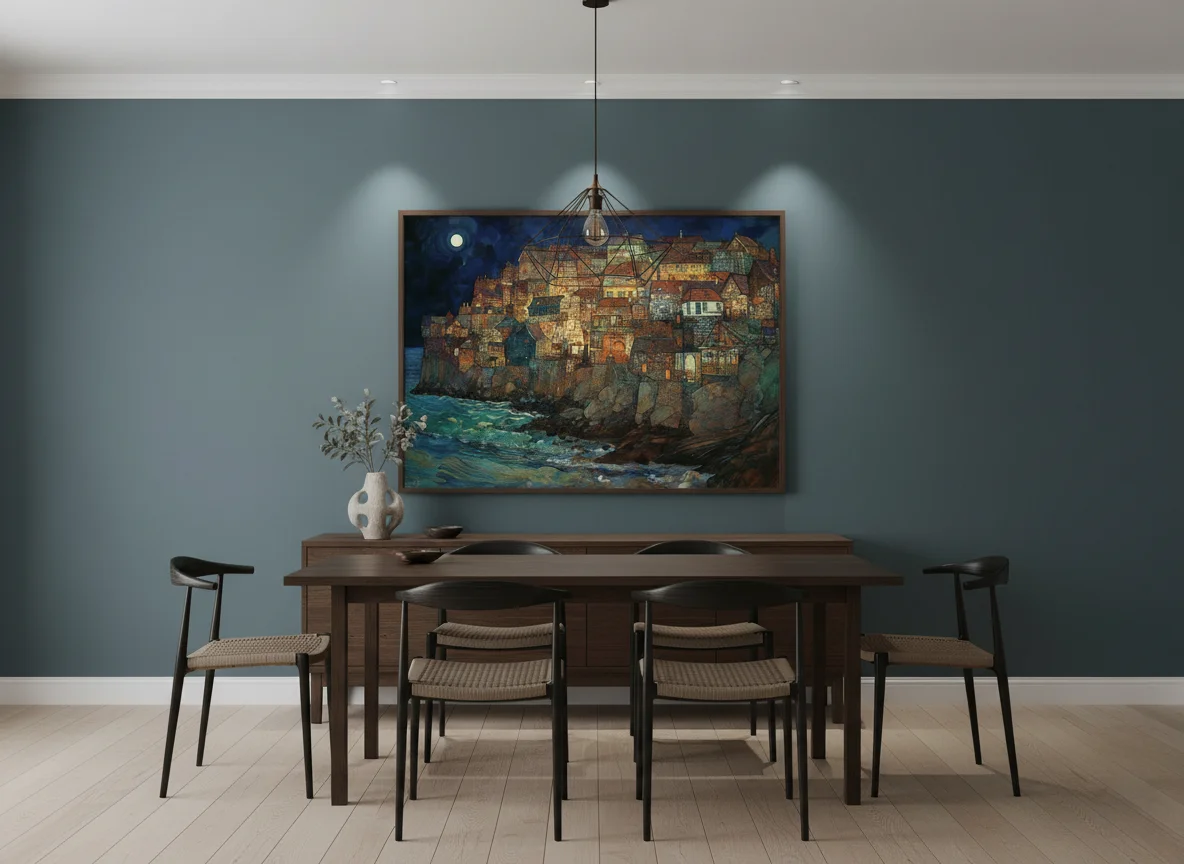 Мозайковият стил и контрастът на „Лунна стража“, между топло и студено правят тази картина визуално богата – тя не се изчерпва при първия поглед. Работи в кабинет, в хол с по-тъмна палитра, в коридор, на който искаш да дадеш характер. Тъмното море в долната част я заземява; луната в горната я отваря. Балансът е вграден.