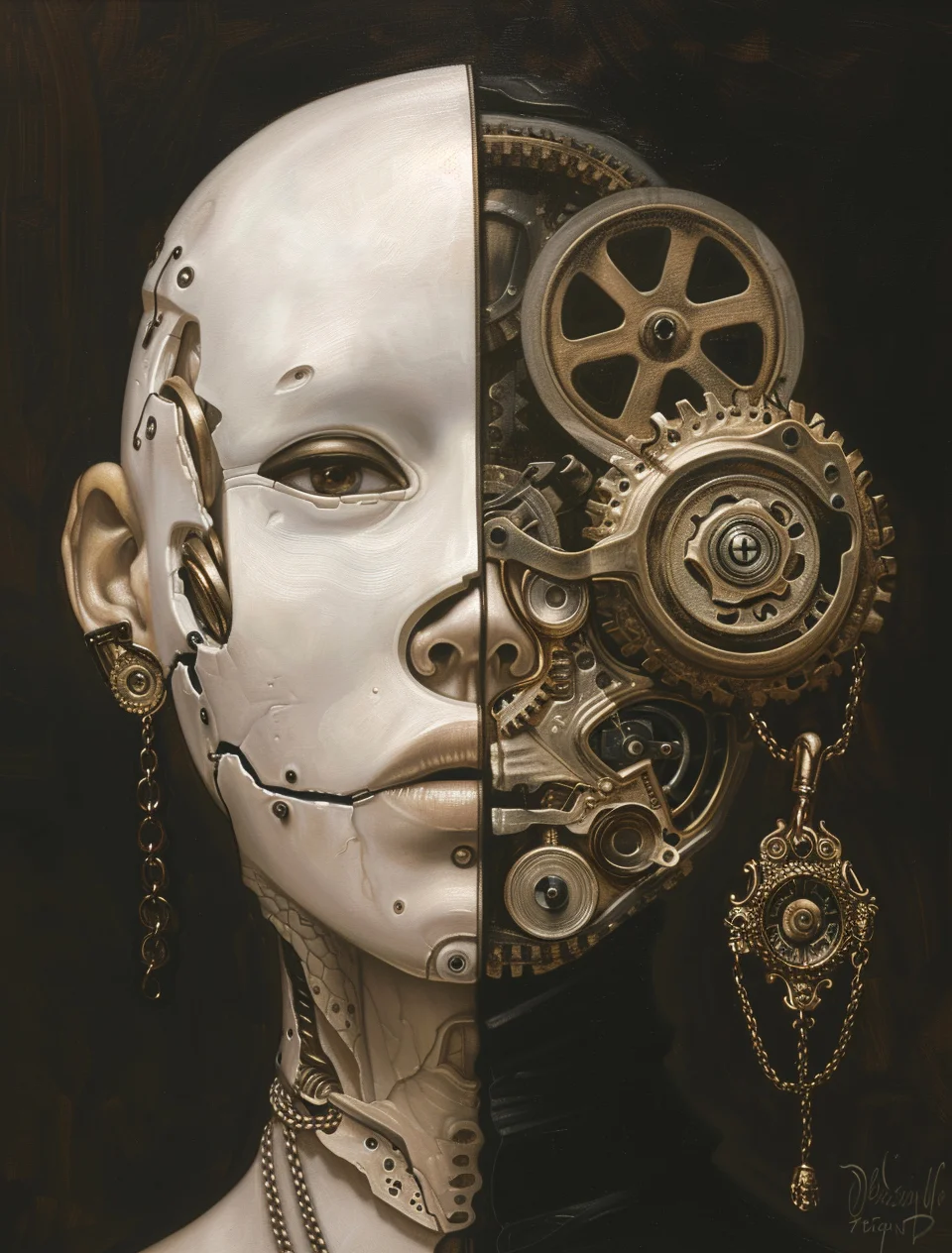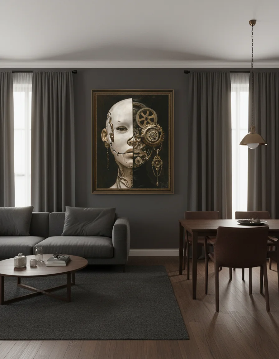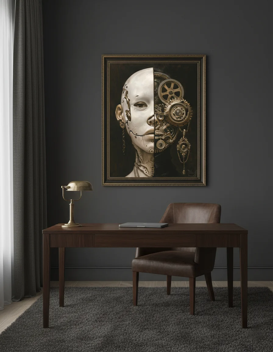 „Механична душа“ е драматичен принт за стена с човешка глава, разделена наполовина – лява страна бяла гладка кожа, дясна механична с бронзови зъбни колела, шевове и вериги на тъмен фон. Композицията носи усещане за дуалност, мистерия, сила и леко бягство в свят на човек и машина. Идеален за кабинет, хол, спалня или пространство с тъмен, футуристичен акцент.
