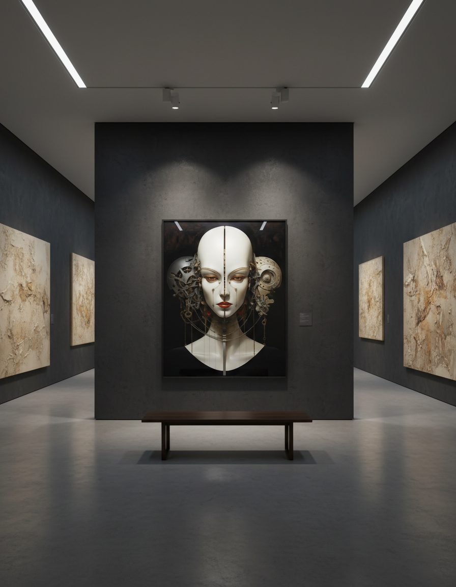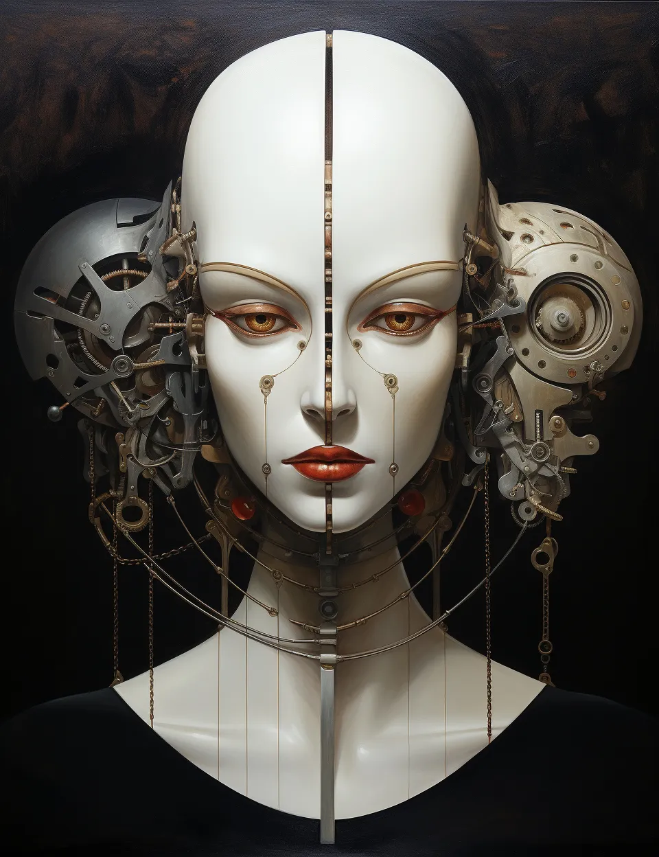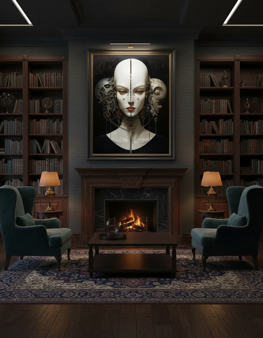 „Механична тишина“ е сюрреалистичен принт за стена, който изследва границата между човешкото и машинното. Централният образ представя женска глава, разделена на две симетрични половини – едната е гладка, бяла и почти порцеланова, а другата разкрива сложна механична структура от метални елементи, зъбни колела и фини детайли. Вертикалната линия на симетрия подчертава контраста между органичното и индустриалното, създавайки усещане за баланс, напрежение и тиха сила.