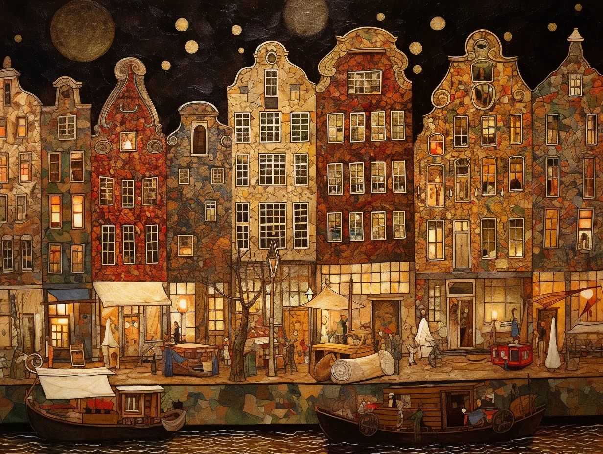 Високите тесни къщи стоят като стражи край водата, всяка с по един топъл прозорец, зад който се случва нещо, което никога няма да разбереш. По улицата има хора – едни бързат, други са спрели без видима причина. Лодките в канала отразяват пулса на нощта. И над всичко това – лунни орбити, почти съновидни, които придават на сцената ритъм, различен от ритъма на реалното.