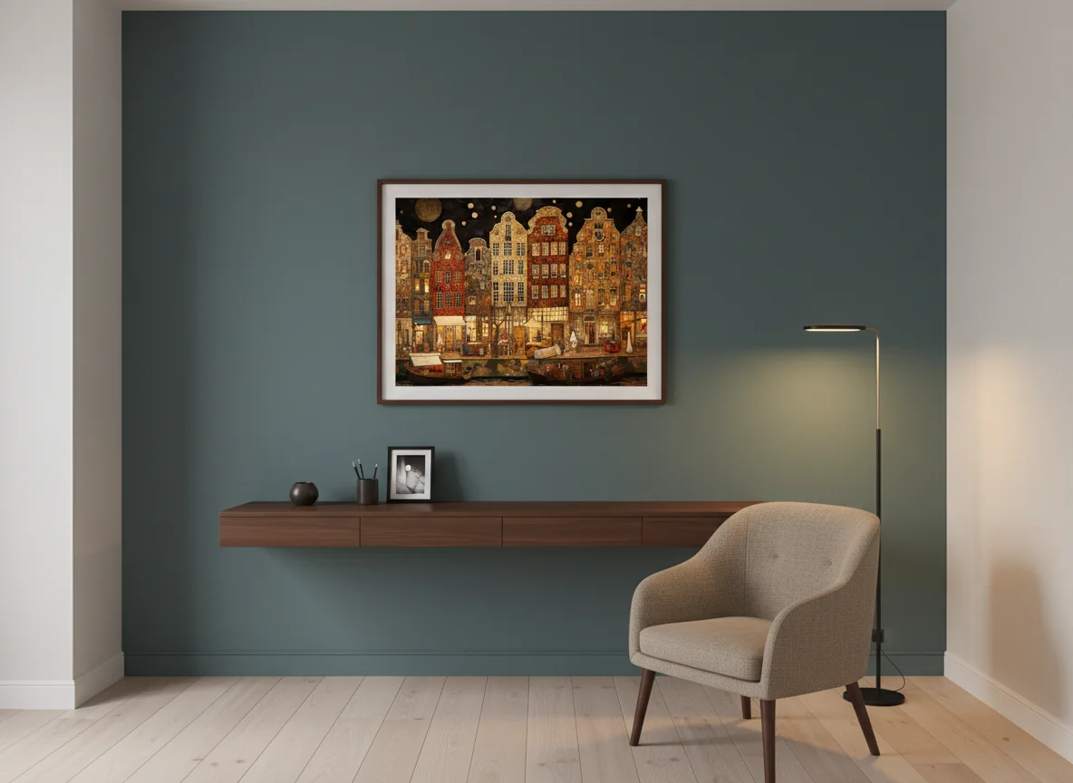 „Нощ над каналите“ е принт с градски пейзаж, в който главният герой не спи – той тлее.