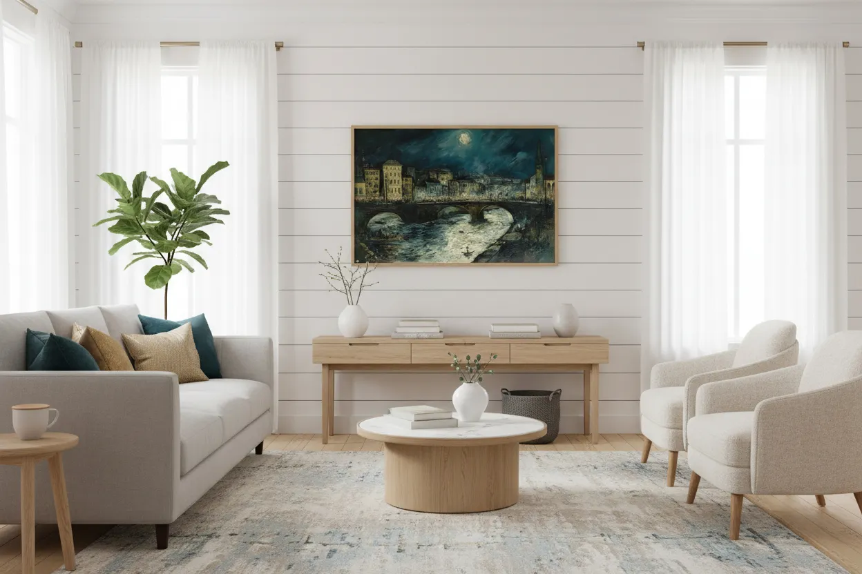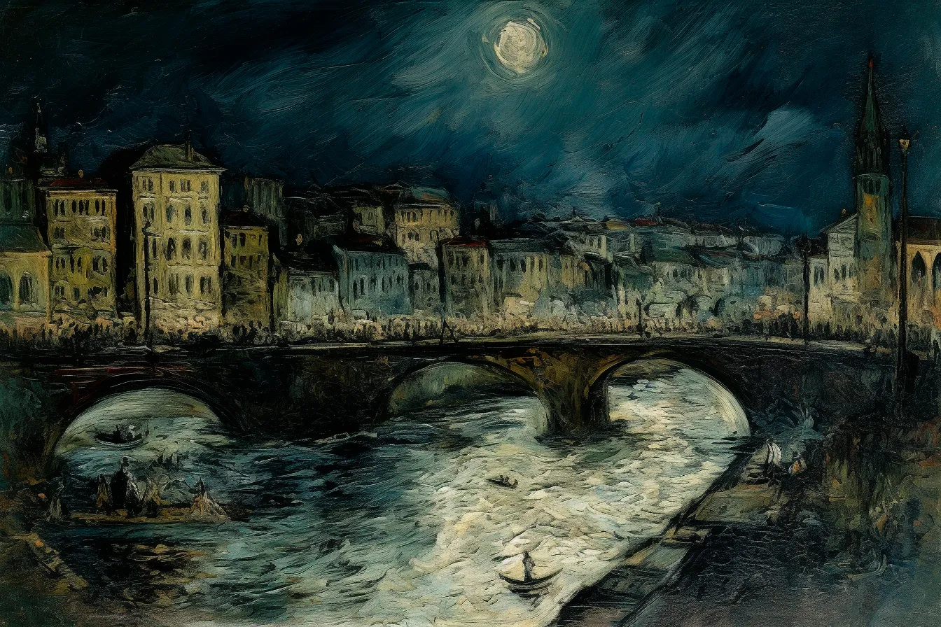 „Нощен мост“ е атмосферeн и магичен принт за стена в импресионистичен стил с нощен град, мост, река и въртящо се звездно небе. Композицията носи усещане за магия, спокойствие, мечтателност и леко бягство от реалността. Идеален за спалня, хол или пространство за размисъл.