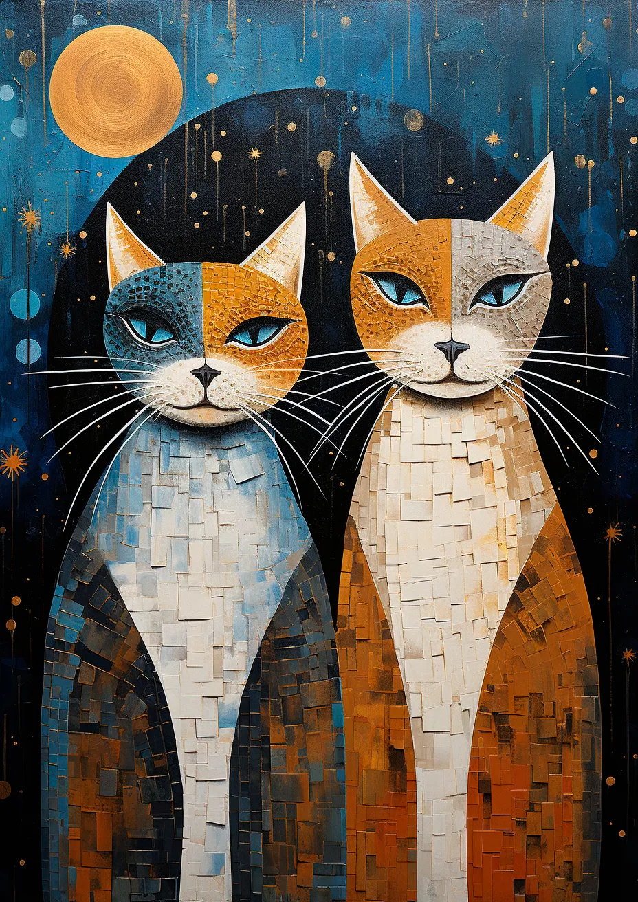 „Нощни спътници“ е артистичен и топъл принт за стена с две котки в мозаечен стил под голяма луна и звездно небе – оранжево-синьо тяло, блестящи очи и магическа атмосфера. Композицията носи усещане за приятелство, нощна магия, уют и леко игриво бягство в света на котките. Идеален за спалня, детска стая, хол или кът за четене…