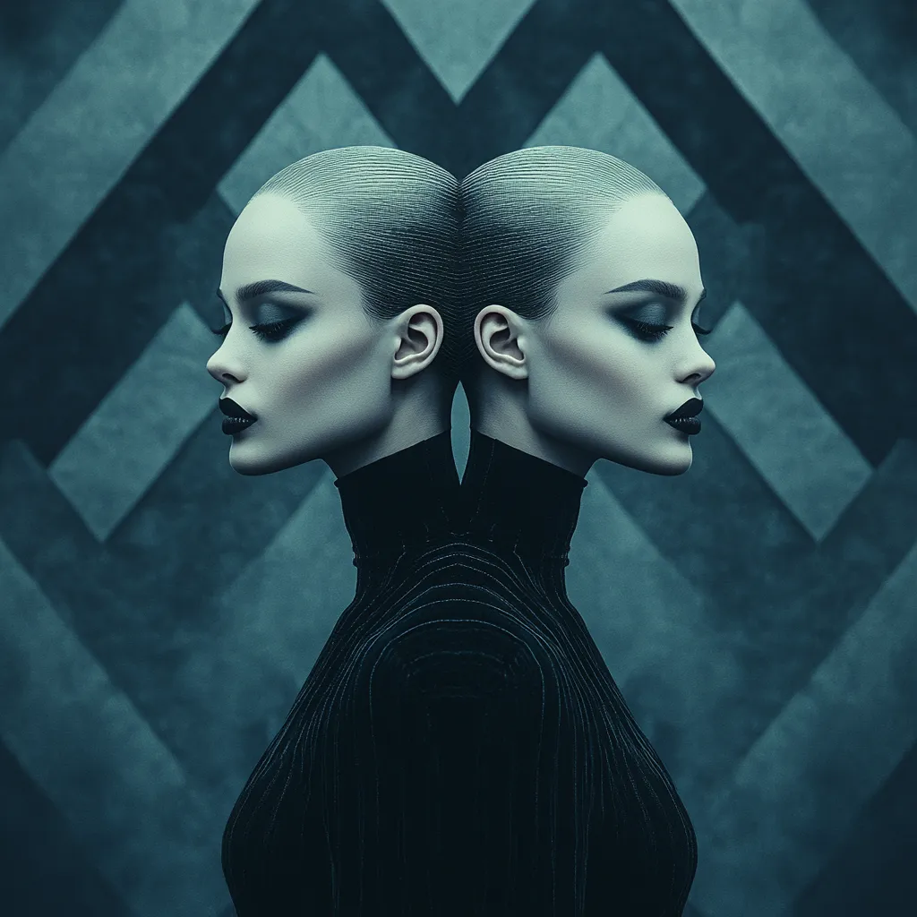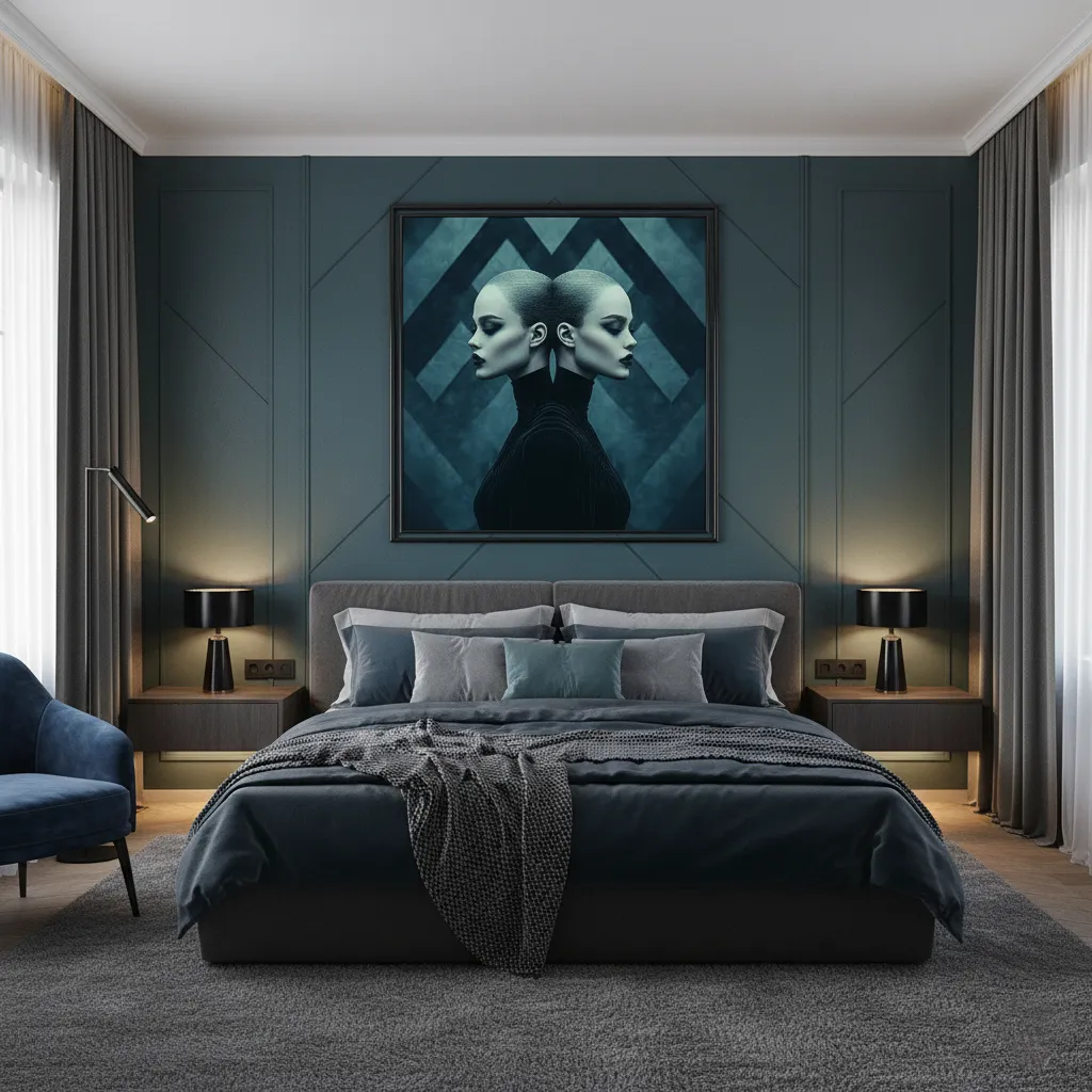 „Огледални сенки“ е сюрреалистичен принт за стена, който показва два слети женски профили с множество форми и текстурирани линии, на фона на геометрични шеврон мотиви в тъмно синьо. Носи усещане за дуалност, симетрия, интроспекция и футуристична естетика. Перфектен за кабинет, хол или пространство за размисъл.