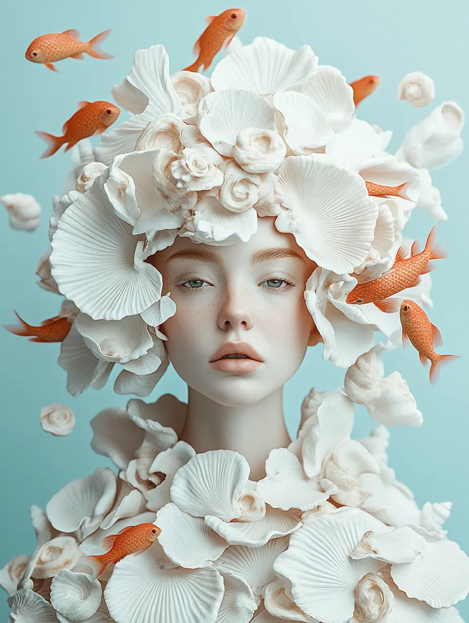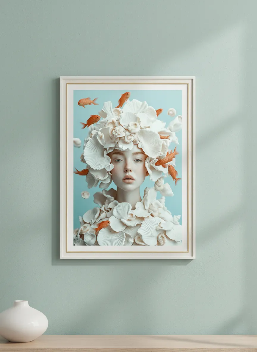„Поток“ е нежен сюрреалистичен принт за стена, в който женският образ е обграден от риби и органични форми. Синьо-бялата палитра носи усещане за чистота и лекота. Принтът е подходящ за спални, арт пространства и спокойни интериори.