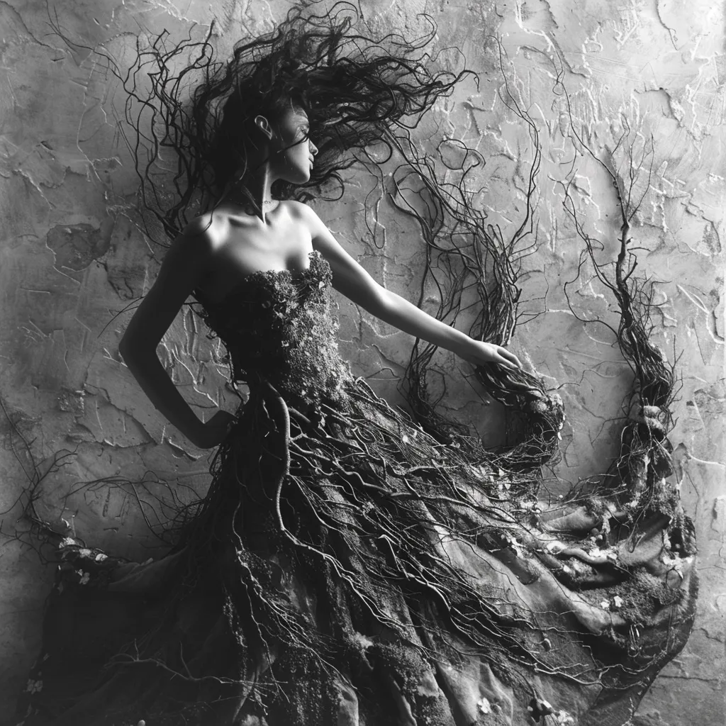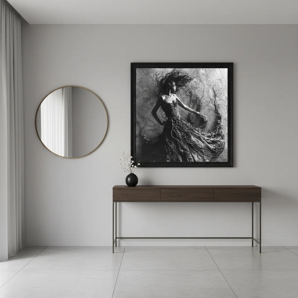 „Прегръдка от корени“ е сюрреалистичен принт за стена, който съчетава женска фигура в рокля от преплетени корени, клони и органични текстури върху текстуриран фон. Носи усещане за връзка с природата, сила, меланхолия и органична красота. Подходящ за спалня, студио или пространство с драматичен характер.