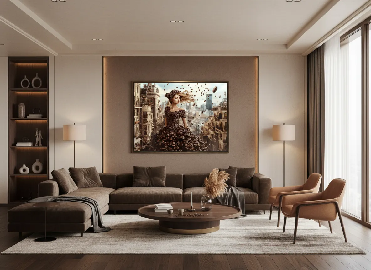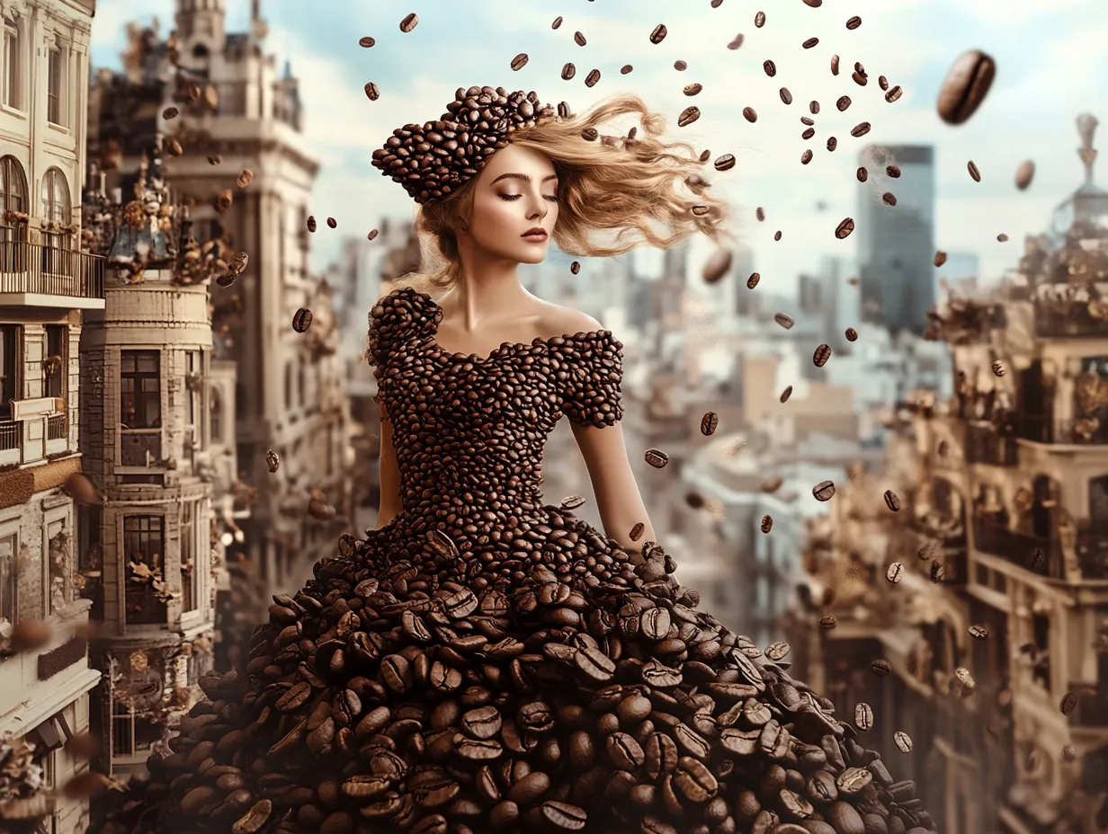 „Следобедно кафе“ е сюрреалистичен принт за стена, който комбинира мода, градска естетика и артистична символика. Централният образ представя женска фигура с рокля, изградена от кафени зърна, които създават усещане за движение и жизненост.