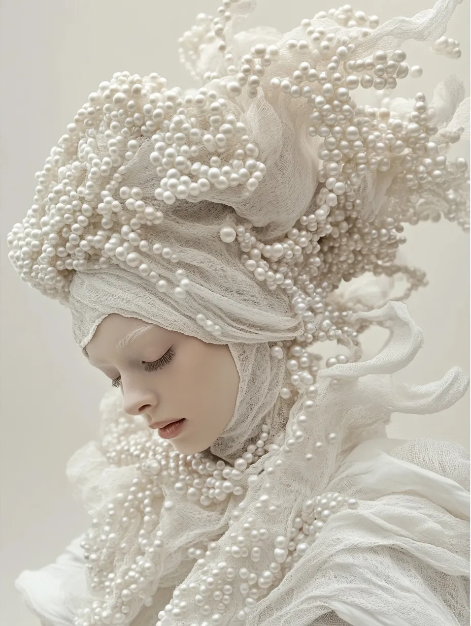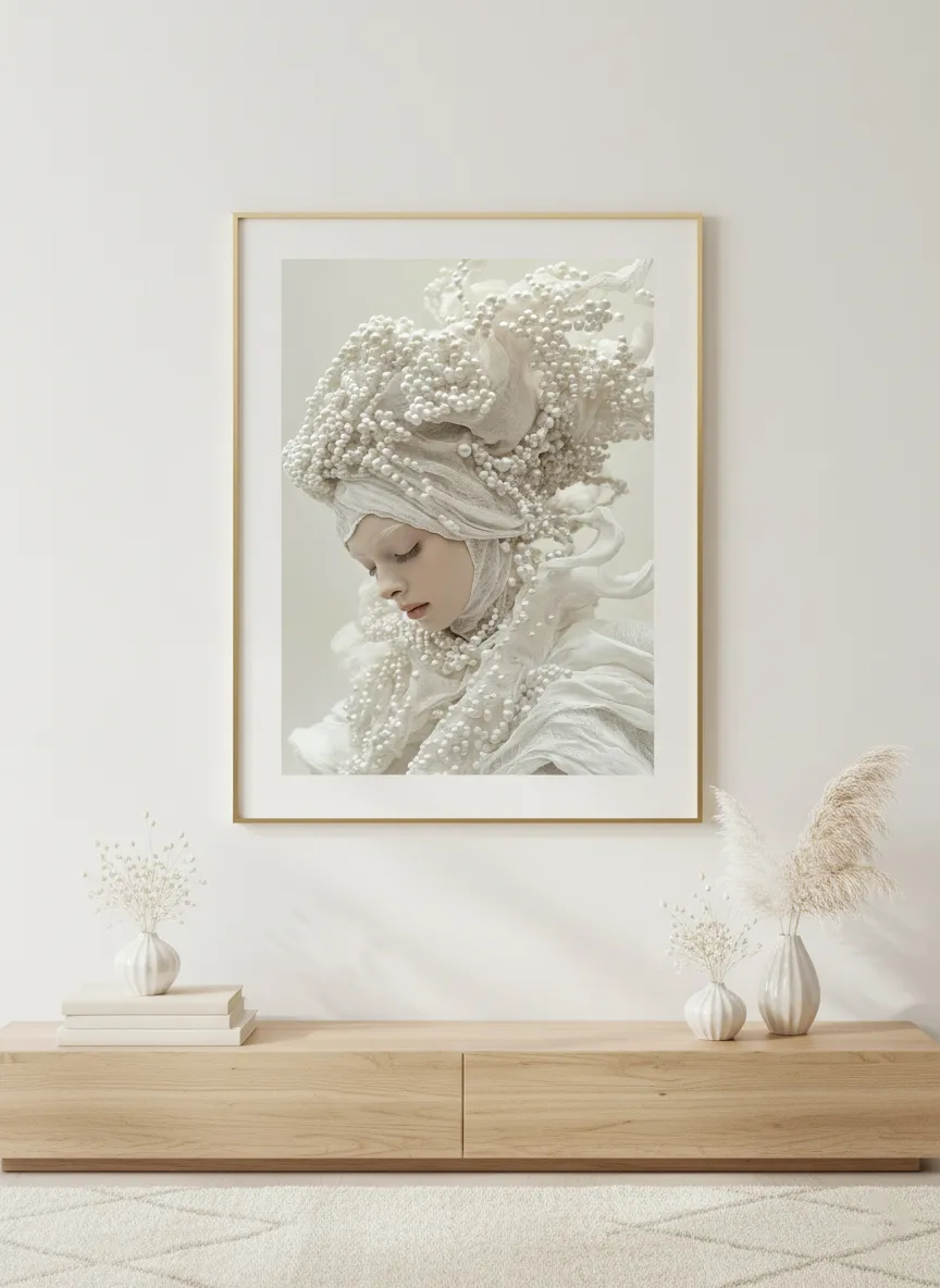 „Тишината на перлите“ е сюрреалистичен принт за стена, който изследва красотата на фините детайли и спокойната естетика на монохромната визия. Централният образ представя женски профил, обвит в текстилна структура и перлени елементи, които създават усещане за лекота и ефирност.