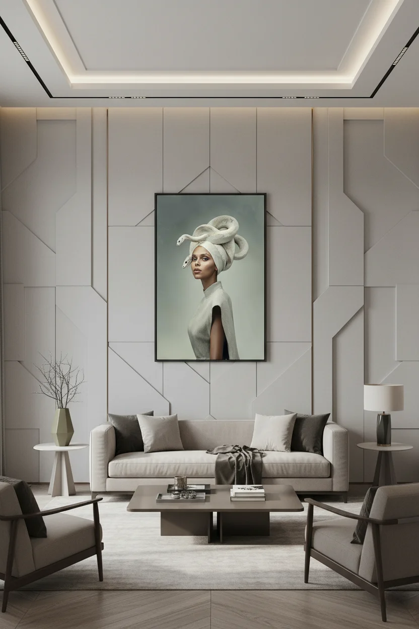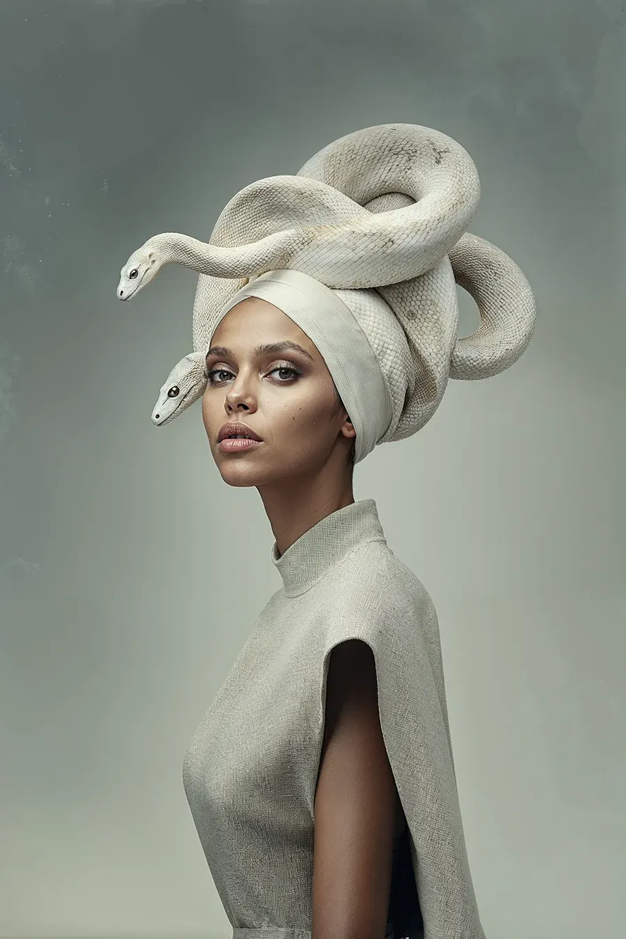 „Змийски тюрбан“ е портретен принт за стена с жена, бяла змия увита като тюрбан и мек пастелен фон в сиво-зеленикава гама. Композицията носи усещане за мистерия, сила и древна символика. Идеален за спалня, кабинет или пространство с тъмен, драматичен акцент.